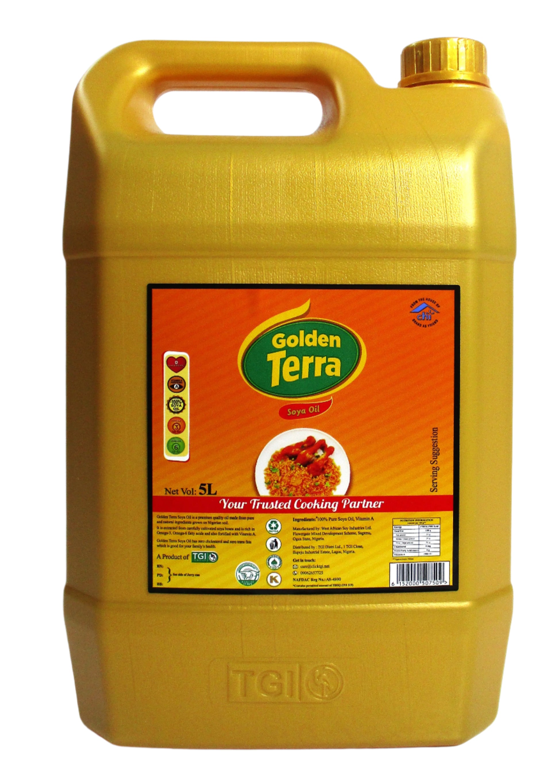 Experience the versatility and health benefits of Golden Terra Soya Oil 5L. Made from high-quality soybeans, it contains 0g trans fats and is cholesterol-free. Use for cooking, frying, and baking to create delicious and nutritious meals. A must-have kitchen staple for every health-conscious consumer.